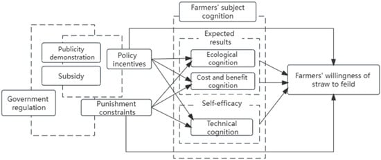Throughout the existing literature, scholars have obtained rich research results on farmers’ straw-to-field willingness and on the application of straw-to-field technology, among which most of the studies on government behavior directly affect farmers’ technology adoption behavior. However, there is still room for expansion in the deficiency of path analysis of farmers’ straw-to-field willingness. Accordingly, government regulation, subject cognition and farmers’ straw-to-field willingness are incorporated into a unified analysis framework in this paper, which takes into account government behavior and farmers’ cognitive factors to supplement existing research deficiencies, reveals the functional path of government behavior, and improves the analysis framework of farmers’ straw-to-field behavior. Secondly, according to the social cognition theory as well as the two aspects of outcome expectation and self-efficacy, this paper builds a farmer’s subject cognition system with four dimensions of cognition: ecological, technical, cost and benefit. Further, the influence of the government’s demonstration, subsidies and punishment constraints on farmers’ straw-to-field willingness was further discussed, and the effective path of government regulation on farmers’ straw-to-field willingness to farmland was tested by influencing farmers’ subject cognition. Thus, this paper reveals the functional mechanism of policy incentives and administrative punishment constraints on farmers’ straw-to-field willingness and provides useful reference for improving farmers’ straw-to-field willingness, implementing local government straw-to-field policy support, and expanding policy effects.