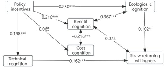 Pathway analysis chart of policy incentives affecting straw-to-field willingness. Note: → Indicates the influence relationship and ←→ indicates the relevant relationship. ***, * shows that the coefficient values are significant at 1% and 10%, respectively.