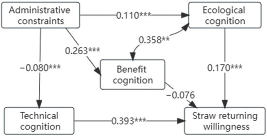 Pathway analysis diagram of administrative constraints affecting the willingness of straw-to-field. ***, ** shows that the coefficient values are significant at 1%, 5% respectively.