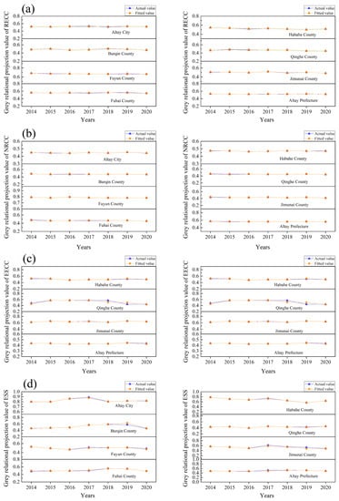 The grey relational projection value of the resource and environment carrying capacity and each subsystem of Altay Prefecture and counties and cities from 2011 to 2020 were obtained according to the grey relational projection model, which was used as the basis data for prediction. The time series method was combined with the BP neural network to forecast the evolution trend of the resource and environment carrying capacity and the risk alarm of each subsystem in Altay Prefecture and counties and cities from 2021 to 2025. As a result, the grey relational projection values of the resource and environment carrying capacity and each subsystem of Altay Prefecture and counties and cities from 2011 to 2020 were used as an input sample set, and the grey relational projection values of the resource and environment carrying capacity and each subsystem of Altay Prefecture and counties and cities from 2014 to 2025 were used as expected output values to construct the prediction samples of the resource and environment carrying capacity and alarm situation of each subsystem of Altay Prefecture and counties and cities. The Matlab R2016a software was used to compile the BP neural network program for sample simulation, and to predict the accuracy through the root mean square error test method. According to Table S1, the BP neural network model had a good fitting effect. The maximum root means square error reached 0.0341, and the minimum was only 0.0008, which was beneficial to predict the resource and environment carrying capacity of Altay Prefecture and counties and cities and the evolution trend of the alarm situation of each subsystem more accurately. The specific fitting effect is shown in Figure 2.