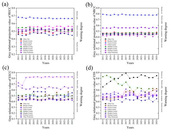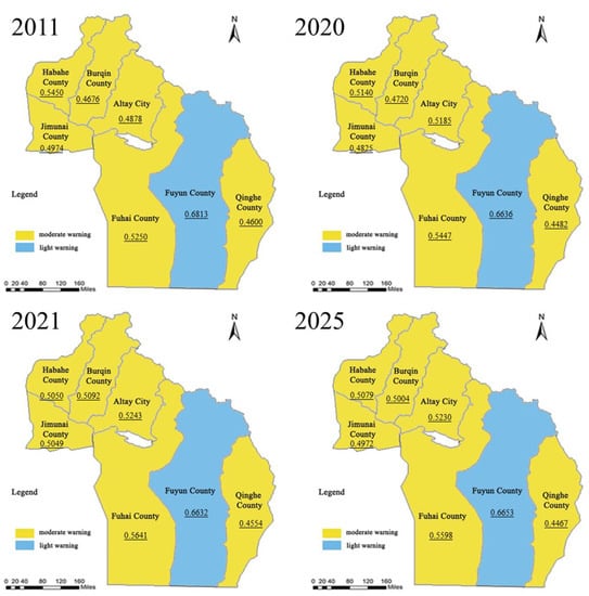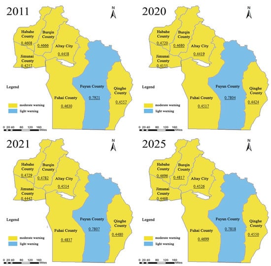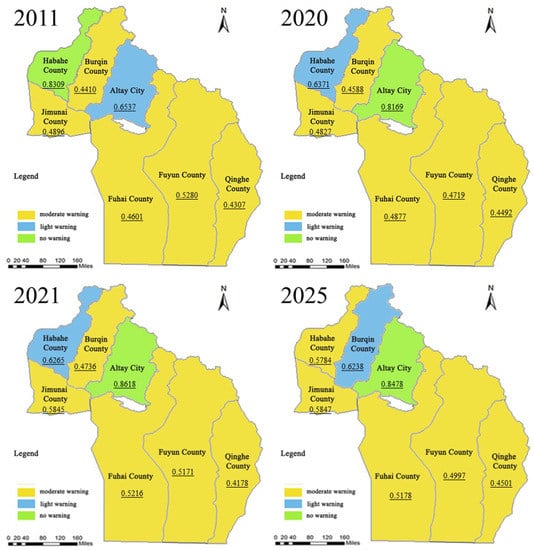 From 2021 to 2025, the eco-environment carrying capacity of the Altay area would not be improved fundamentally, and the grey relational projection value showed a fluctuating trend (Figure 3c and Table S4), and would be 0.4279 in 2025. However, the change was limited, the degree of alarm continued to be “moderate warning”, and the signal light continued to be “yellow light”. From 2021 to 2025, the warning of eco-environment carrying capacity of all counties and cities in Altay Prefecture except Burqin County would be controlled, as the grey relational projection value had rebounded (Figure 3c and Table S4). Among them, the grey relational projection value of Fuhai County increased to 0.8268, the alarm level continued to be “no warning”, and the signal was “green light”. The grey relational projection value of Jimunai County increased to 0.6474, the alarming degree remained in the state of “light warning”, and the signal light was “blue light”.