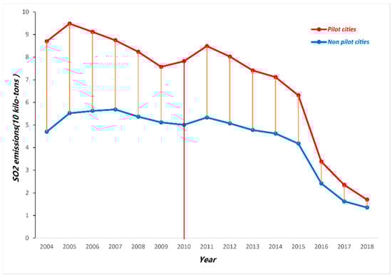 The difference-in-differences (DID) method has been widely used in econometrics recently. The 2008 policy pilot for China’s innovative cities is an exogenous policy shock caused by the industrial sector’s SO2 emissions, which can be seen as a “quasi-natural experiment”. To use the DID model, it is necessary to ensure the randomness of the sample selection and parallel trend test []. To consider the time difference in the implementation of the CIPCP and to evaluate its impact on industrial sector SO2 emissions scientifically, we followed the studies of Dong et al. (2019), Pei et al. (2019), and Popp (2006), and constructed the following regression model [,,]: