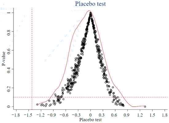 Although this study controlled for relevant variables that may affect industrial SO2 emissions in a quasi-natural experiment, it is still possible that unobserved city-specific factors interfered with the results. To address this issue, this study followed Liu and Lu (2015) and randomly generated both a pseudo-treatment group dummy variable [], “Form”, and a pseudo-policy dummy variable, “Moment”, for the 260 sample cities in 500 random draws. The results indicate that the generated regression coefficients are mostly centered around 0 and have p-values mostly above 0.1 (shown in Figure 4). In contrast, the estimated coefficient for the actual policy is −1.4199, which falls outside the range of the generated regression coefficients. This suggests that unobserved city-specific factors did not interfere with the results and that the conclusion of this study, that the CIPCP has a significant and robust effect on reducing industrial SO2 emissions, passed the placebo test.
