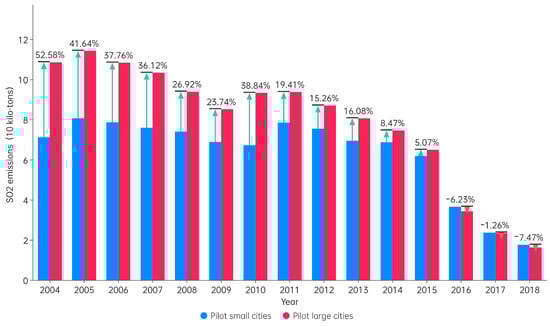 The reduction in industrial SO2 emissions among pilot cities in different regions of China.