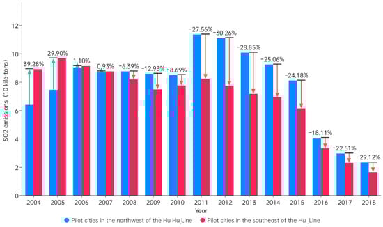 The Hu Huanyong Line (Hu_Line) is used to restrict regional characteristics in China. This line divides the country into two parts, the east–west and the north–south, with high urbanization and population density in the southeastern region and low urbanization and population density in the northwestern region []. Such regional characteristics may have different impacts on the effectiveness of the CIPCP in reducing industrial SO2 emissions. We constructed a virtual variable for the Hu_Line to investigate this. Specifically, cities located southeast of the Hu_Line were assigned a value of 0, while those to the northwest were assigned a value of 1. We incorporated this and the virtual policy variable into the baseline regression model. The results are shown in Table 3, column (2). The coefficient for the interaction term of Hu_Line and Inno_policy is 2.2399, which is significant at the 5% level. As shown in column (2) of the baseline regression Table 1, the coefficient of Inno_policy is −1.4337. This implies that the CIPCP has a more significant effect in reducing industrial SO2 emissions in cities southeast of the Hu_Line than those found in the northwest. Figure 6 illustrates the reduction in industrial SO2 emissions among pilot cities in different regions of China (The arrows in the figure represent the gap in the emission reduction capacity of cities in the Southeast region compared to cities in the Northwest region). Notably, the emissions from industrial sources in pilot cities located southeast of the Hu_Line have been consistently lower than those located northwest since the policy was implemented in 2010. This may be attributed to the higher economic and technological development in the southeastern cities, which decreases towards the northwest, and its influence on reducing industrial SO2 emissions in Chinese cities.