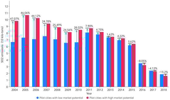 Figure 7 compares industrial SO2 emissions in pilot cities with different market potentials (the arrows in the figure represent the difference in emission reduction capacity between the low-market potential pilot cities and the high-market potential pilot cities). The pilot cities with a higher market potential had higher industrial SO2 emissions than those with a lower market potential before 2010. Still, they gradually reduced their emissions after 2010, demonstrating that cities with a higher market potential have more potential for lowering industrial SO2 emissions.