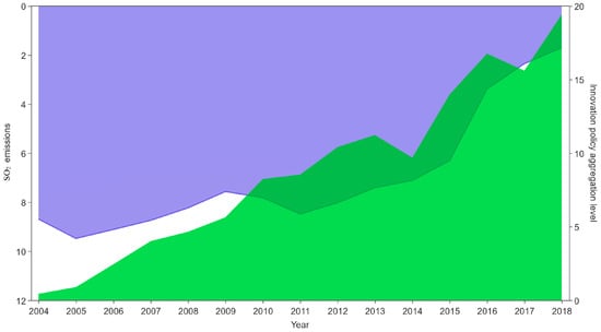 Figure 9 shows an inverse relationship between industrial SO2 emissions and the number of innovation policies, further demonstrating that innovation policies reduced industrial SO2 emissions. The emission trading mechanism (ETS) in innovation policies restrained industrial sectors from emitting pollutants, reduced fossil fuel consumption, and improved energy utilization efficiency, ultimately achieving industrial SO2 emission reduction.