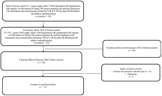 In order to construct scientific mapping of the research domains explored in this study, we retrieved articles from the “ISI Web of Science Core Collection” database. We set our search string as TS = (green supply chain* AND (digitization OR digitalization OR Industry 4.0 OR Internet of Things OR cloud computing OR artificial intelligence OR information and communication technolog* OR ICT OR big data OR blockchain OR additive manufacturing)). This search led to an initial result of 336 articles. To further check the consistency of the results and the strength of the search string, we split the single keyword “green supply chain” into “green” AND “supply chain” [57,58,59]. This second search produced 336 articles, in line with the initial search and thus confirming that the search string strategy was suitable, consistent and comprehensive, as no relevant articles were excluded when the unique term “green supply chain” was adopted (TS = (green AND supply chain* AND (digitization OR digitalization OR Industry 4.0 OR Internet of Things OR cloud computing OR artificial intelligence OR information and communication technolog* OR ICT OR big data OR blockchain OR additive manufacturing)). By filtering the results to select the “Web of Science SSCI Index”, we obtained a dataset of 176 articles. By selecting the SSCI database we ensured that we were producing a dataset of only articles published in the best peer-reviewed journals that had impact factors and that referred only to social science domains such as business and management, in line with previous researches [58,60].