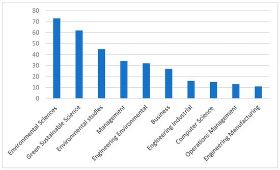 Using general information from the 131 articles retrieved, initial descriptive statistics are provided as a part of our bibliometric analysis. The bar chart in Figure 2 shows the distribution of the articles by topic, according to Web of Science categories. The articles cover a number of research areas, although the largest portion of publications pertains to the field of environmental science and environmental studies. This may indicate the multidisciplinary nature of the theme of green supply chains and digital technologies and it has probably stimulated the cross-fertilization of different fields. Moreover, many papers appear in more than one category, which explains why the sum of articles comprising all research areas is greater than 131. Along with the most relevant areas for business, management, and business and management science, we can also find categories such as environmental science, green sustainable science technology, and environmental studies, confirming the importance of the topics under investigation from an environmental perspective. Other technical and engineering-based areas are industrial engineering, environmental engineering, manufacturing engineering, operations research, and computer science.