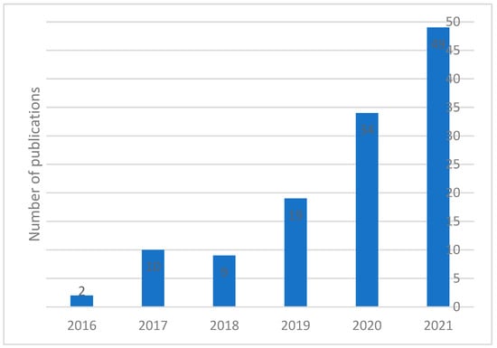 The bar chart in Figure 3 reveals the novel nature of the topic, as we can see that the oldest articles were published in 2016, followed by steady growth peaking in 2021. The number of articles for 2022 is incomplete due to the fact that data collection stopped at end of February 2022.
