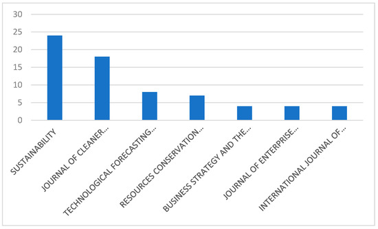 The distribution of the articles in terms of journals shows a low level of concentration, with many different journals contributing to the publication of the 131 articles in our dataset. A deeper look at the most prolific journals enables us to identify the most favorable outlets for the topics under investigation. At the top position we find Sustainability with 24 articles, followed by the Journal of Cleaner Production with 18 articles, Technological Forecasting and Social Change with 8 articles, and Resources Conservation and Recycling with 7 articles. These are followed by a few journals with 4 articles each: Business Strategy and the Environment, the International Journal of Production Research, and the Journal of Enterprise Information Management. Other journals published only 3 articles: Industrial Management & Data Systems, IEEE Access, the International Journal of Environmental Research and Public Health, and the Transportation Research Part E-Logistics and Transportation Review. The rest of the articles are spread across several other journals which published one or two articles. The bar chart in Figure 4 shows the journals that have published more than 4 articles.