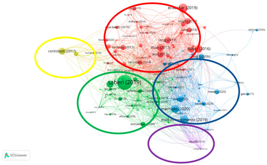 The scientific map obtained through analysis of the dataset conducted with VOSviewer is reported in Figure 5. Each node represents an article, while each link represents the bibliographic-coupling relationship. The size of the nodes represents the number of citations the article has received over time, revealing the scientific importance of the article, while the distance between nodes represents similarity or difference between articles (as measured by bibliographic coupling). Finally, the color of the nodes identifies the clusters the articles belong to.