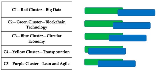 Cluster 4 (transportation) and Cluster 5 (lean and agile approaches) can be defined as research areas that deal with topics traditionally related to logistics (Cluster 4) and operations (Cluster 5). In this sense, “transportation” and “lean and agile approaches” clusters echo themes related to efficiency and logistics, and to the problem of managing flows while minimizing costs. Digital technologies are of great importance as concerns the green performance of transportation and logistics; therefore, the topic of sustainability shows strong relevance in Cluster 4. Similarly, as concerns lean and agile approaches in supply chains as well, the adoption of digital technologies is an important enabling factor to promote lean practices. For example, wearable technologies like smart glasses can be used in warehouses to increase the speed of operations and efficiency. Therefore, we can conclude that the intersection between the topics “green” and “digital” is strong both in Cluster 4 and Cluster 5. However, the limited number of papers comprised in these clusters reflects a peculiar yet interesting trait of this research domain, since scholars typically analyze the topics of transportation and lean and agile operations as single phases of the supply chain, rather than considering them within the context of the whole supply chain. The synthesis of the overlapping degree of the topics is summarized in Figure 6.