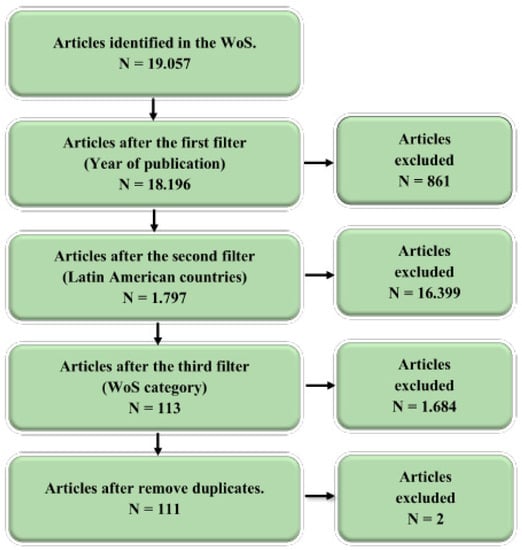 The choice of WoSCC as the database for this review is based on the fact that it is recognized internationally among researchers for incorporating high-profile journals from various disciplines of knowledge; in addition, it is a leading source of scholarly research data because it offers trusted coverage and metrics, which makes it one of the main tools for bibliometric studies [26,27].