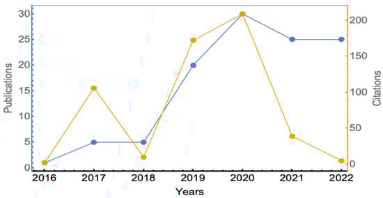 A total of 111 publications indexed in WoS were retrieved. While the period for this bibliometric analysis begins in 2015, the year in which the UN proposed the SDGs, the first work identified in the sample was published in 2016. Generally, (see Figure 2), an upward trend in the number of publications can be observed, with a peak of 30 articles in 2020. If the extremes of the period are considered, a significant increase in the productivity of Latin American authors can be observed, as they went from having one publication in 2016 to 25 in 2022.