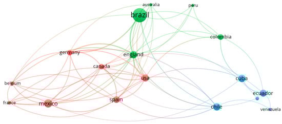 The map of international collaboration is shown in Figure 3. VOSviewer identified three clusters (red, green, and blue). The red cluster has the most significant number of countries (seven) and is led by Mexico as the Latin American country. Brazil and Mexico are the most collaborative countries in the region, and Chile, Colombia, Cuba, and Ecuador follow them. Brazil’s strongest collaborations are with England (link strength = 9) and Germany (LS = 6), while Mexico’s are with France (LS = 3), Belgium (LS = 3), Spain (LS = 3), England (LS = 3), Canada (LS = 3), and the United States (LS = 3).
