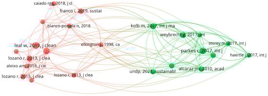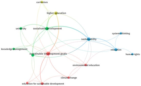 Some 8 of the 111 articles in the sample cite the work of Leal Filho et al. [39]. Here, the authors explore how universities are adopting the SDGs and the advantages of introducing these goals in teaching. This work is followed by Parkes et al. [40] and Ávila et al. [41], with seven citations each. The first puts research around PRMEs at the center, while the other analyzes the barriers to innovation and sustainable development in universities. The following three studies have six citations each. They address issues such as the relationship between the SDGs and education in business schools [10,42] and the statements, charters, and partnerships developed in higher education to aid in improving effectiveness in sustainable development [43].