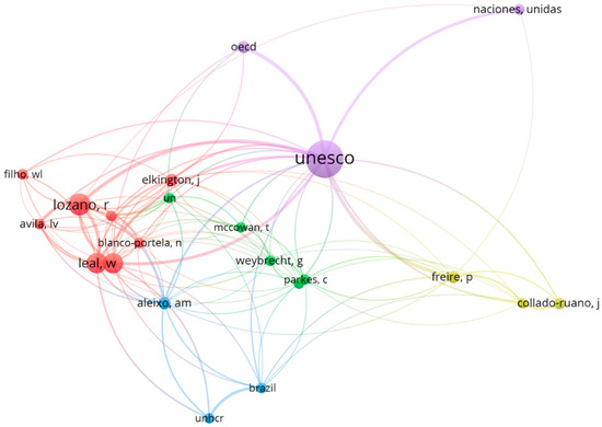Table 6 shows the most influential publication in the sample, in which the Brazilian Enrique Falceto de Barros participates, collaborating with professionals and academics from different parts of the world, with 52 citations. This publication [30] provides a consensus statement that seeks guidelines for the education of health professionals in pursuit of sustainable health care. It is followed by the work of Avelar et al. [4], who systematically reviewed the literature on education to advance the implementation of the SDGs.