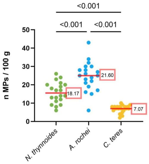 The highest number of microplastic particles (MPs) was found in A. rochei (21.60 ± 8.70 MPs/100 g), followed by N. thynnoides (18.17 ± 7.93 MPs/100 g) and C. teres (7.07 MPs/100 g) (Figure 1). This is possibly because A. rochei feeds on a broader variety of marine species compared to the other two species. In addition to zooplanktons, the mackerel tuna A. rochei feeds on small fish, fish larvae, crustaceans, and also shrimp [22]. MP contamination has also been highly detected in fish larvae, with 66% being mostly fibers [23]. Previous reports have shown that lower trophic species show a higher risk of MP contamination [24]. This is due to the feeding strategies of lower trophic organisms [24]. Hence, higher-level organisms presumably suffer from the accumulative negative effects of MP contamination from lower food chain level organisms [25].