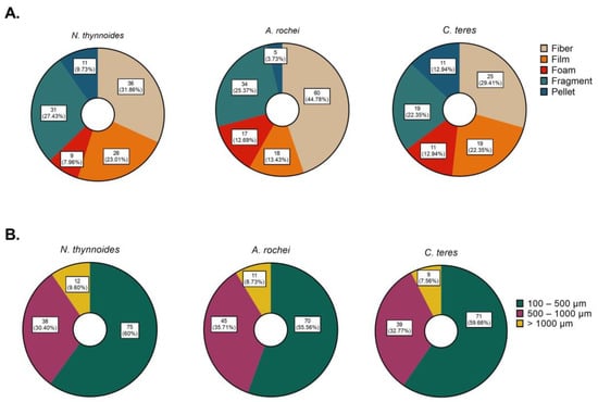 Notably, the pelagic fish N. thynnoides and A. rochei both showed significantly higher microplastic numbers compared to C. teres. A previous report by Pan et al. (2021) also showed that pelagic fish had more microplastic contamination compared to midwater fish [26]. There are less MPs in the midwater area, which mostly suspends to the surface, compared to the pelagic area, where MPs settle to the bottom of the ocean and attach to reefs.