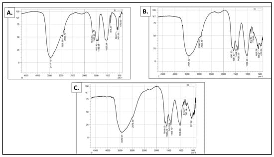 FTIR spectra of representative MPs isolated from different commercial fish species, (A) N. thynnoides, (B) A. rochei, and (C) C. teres.