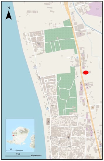 Fish were collected from Bintaro market, one of the major fish markets in the West Nusa Tenggara (WNT) province (8°33′30.4″ S 116°04′33.0″ E) from July to August 2022 (Figure 4). This market is located in the urban area of the city, which is also near agricultural activity and fishing sites. Fish species were selected based on local information regarding their consumption rates. The three most popular marine fish consumed from the market were used in this study: Naso thynnoides, Auxis rochei, and Caesio teres (Figure 5). The references used for the identification of the fish species in this study referred to the books of White et al. (2013) and the Food and Agriculture Organization of the United Nations (FAO, 1997) [84,85]. All fish samples were transported in ice boxes and stored in the freezer at −20 °C prior to analysis for the identification of microplastics.