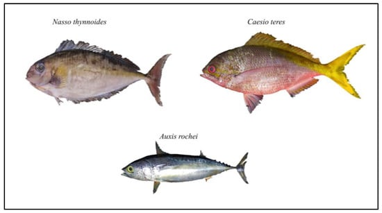 All the fish species were of variable lengths and weights (Table 2). The fish A. rochei was the smallest at a total length of 23.33 ± 0.76 cm, followed by N. thynnoides and C. teres which were of similar lengths, 27.43 ± 0.60 cm and 28.33 ± 2.31 cm, respectively. Similarly, the fish A. rochet was of the lowest weight (149.53 ± 10.76 g). However, the fish C. teres (342.53 ± 5.47) was significantly heavier compared to N. thynnoides (274.70 ± 6.74 g). The fish A. rochei and N. thynnoides are both semi-pelagic and appear in large schools [89,90]. Only the yellowback fusilier C. teres lives in large midwater groups [91]. All three fish species usually feed on zooplanktons. However, A. rochei fish also feed on smaller fish, particularly anchovies and also crustaceans [92].