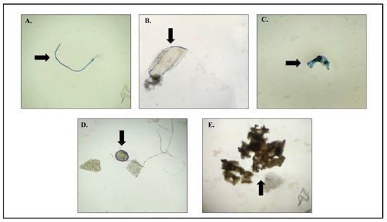 The filtered microplastic samples were observed under a brightfield microscope (Nikon Ti2 Eclipse, Melville, NY, USA). The microplastics were counted and measured with the ImageJ software 1.52v [97]. A classification of the microplastics was conducted based on their morphotypes and size. The microplastics appeared in various colors: black, yellow, red, blue, green, and white. The morphotypes of the microplastics were divided into fiber-type, film-type, fragment-type, foam-type, and pellet-type [98]. Fiber microplastics were classified based on the criterion of appearing in a film-type microplastics consisted of thin sheets, foam microplastics were sponge-like structured shapes, the fragment microplastic type was of a hard angular shape, and the pellet microplastic type was smooth and spherical (Figure 6) [99]. The microplastics were also classified into three different size groups: 100–500 µm, 500–1000 µm, and <1000 µm with a stainless steel sieve [99]. The MP samples collected from the fish species were subjected to Fourier-transform infrared spectroscopy (FTIR). The MP samples were analyzed by a FTIR machine (Bruker Tensor II, Ettlingen, Germany) of a size of 500–4000 cm−1. A plastic material with a particle size lower than 1 µm is currently categorized as a nanoplastic [100]. Compared to microplastics, nanoplastics are reported to be more abundant and harmful; however, the mechanism and processes are still less understood [101].