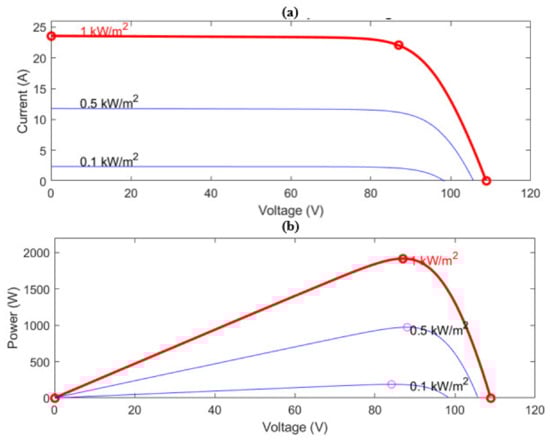 The PVA with the power rating of 1.918 kWp, consisting of the input of this design, is sub-composed of multiple PV modules, each of a smaller power rating. Using the Series-Parallel (SP) interconnection scheme, the PVA is accordingly built. This type of PV Reconfiguration (PVR) is adapted among many others, such as parallel, series, Total Cross Tied (TCT), Honey Comb (HC), skyscraper puzzle, Sudoku, etc. [107,108,109,110,111,112,113,114,115,116] due to its superiority in terms of elevated efficiency and less need of extra interconnecting wires. The SP scheme is hence found optimum and would present an advantageous point for the future industrialization of the design, in regards to the system’s cost efficiency. The electrical characteristics for each PV module composing the PVA are shown in Table 1. According to the parameters shown in Table 1, the PVA characteristic curves, such as Current-Voltage (I-V) and Power-Voltage (P-V) are plotted in Figure 1.