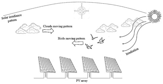 It can be noticed from Figure 1 that the maximum power affordable by the PVA at the Standard Test Conditions (STC) under an irradiance of and temperature of is 1.918 kWp. The PVA, however, can encounter different shading scenarios, inhibiting it thus from achieving its maximum power capacity. This is mainly due to non-static shadow reflectors, such as moving clouds, birds, and other obstacles as shown in Figure 2.