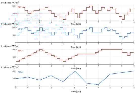 In order to study the negative impacts of the probable rapidly fluctuating irradiance inducers as in Figure 2, a time-based irradiance signal generator is derived in this work, within a time frame of 10 s. The sensitivity of irradiance is set for with a maximum time lapse of 1 s, as shown in Table 2, for different Solar Irradiation Patterns (SIPs). The logic behind the four shading patterns creation in Table 2 is derived after several assumptions, stating that at a defined time , the incident irradiation hitting the PVA surface is of a constant value , resulting from clouds/birds’ passage. For each irradiance value from 100 to 1000 , as well as for each SIP, indicated is the time of irradiance-subjection. For example, in Table 2, the SIP2 has no time window during which the PVA is subjected to an irradiance of 100 where this same condition also applies for SIP3. For SIP4 from another side, the PVA is subjected to an irradiance of 1000 , for example, only at t = 5 s and t = 10 s. This corresponds to the logic for all SIPs in Table 2. According to the values driven in Table 2, the graphical representation for different shading patterns, SIP1, SIP2, SIP3, and SIP4 is presented in Figure 3.