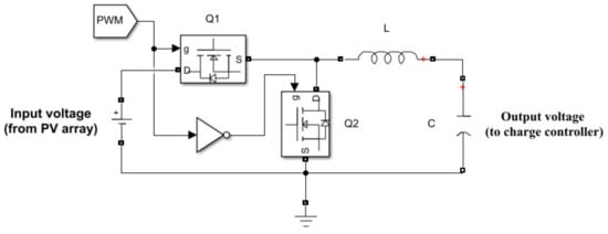 The Pulse Width Modulation (PWM) label shown in Figure 4 is obtained from the MPPT algorithm. The logic “NOT” gate, which is used in generating the gate signal to Q2, is there to ensure that both Q1 and Q2 are never conducting at the same time, thus eliminating any possibility of a bolted electrical short-circuit. Concerning its working routines, the circuit in Figure 4 operates under two modes: