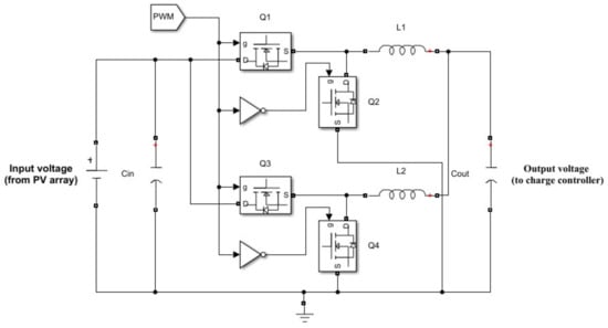 As intended to pull down the PVA output voltage, near the ESS voltage whilst maintaining the conservation of input/output power equalities, an interleaved synchronous buck converter is adapted in this work. First and foremost, the synchronous circuit form for the converter is an improved modification referring to the conventional buck converter [117]: the replacement of the diode with another solid-state switch (e.g., Metal Oxide Semi-conductor Field Effect Transistor (MOSFET), Insulated Gate Bipolar Transistor (IGBT), etc.) will negate any voltage drops across the diode, hence lowering losses and elevating the converter’s efficiency. The synchronous buck converter is shown in Figure 4.