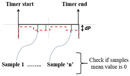 - Continuously check whether is equal or not to zero, by establishing a timer at each time interval: if the sampled values of within the interval have a mean value of zero, then the entire power difference is equal to zero in that timing frame as shown in Figure 7.
