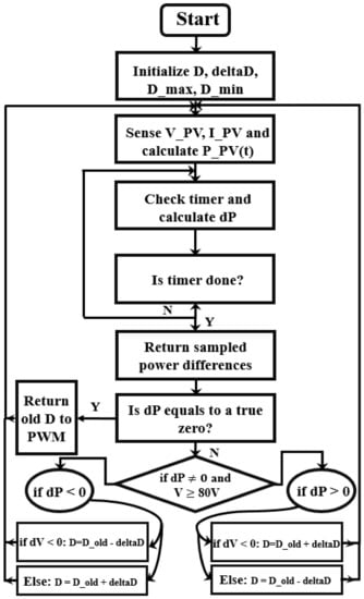 This sampling method could decrease the performance efficiency of the algorithm by requiring more time for execution. This in turn can be compensated by a conditional statement at each checkpoint of . According to the I-V and P-V curves shown in Figure 1, the power difference can be checked after the voltage is equal to 80 V, since the maximum peak lies to its right. The complete modified P&O flowchart is expanded in Figure 8.
