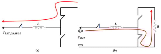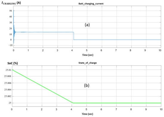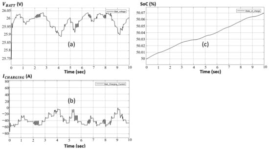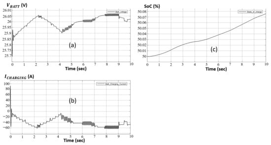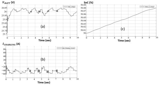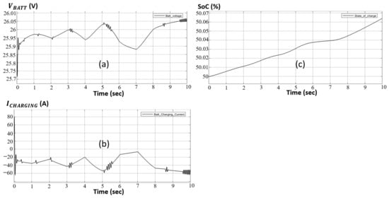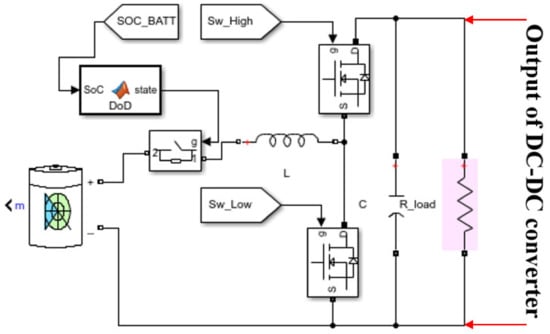 According to Table 4, when the charging current provided by the PVA exceeds 58 A, the battery’s internal electrodes become flooded, thus risking deterioration and posing hazards to the surrounding environment (i.e., risk of burnouts, explosions, etc.). Consequently, the designed bi-directional DC-DC converter offers current charging safety for the battery, with respect to the data in Table 4. From a first point of view, the battery’s charging current should never exceed 58 A, where the DoD must never be below 25%. This converter is designed using two MOSFET switches, one for the charging process, the other for the discharge, with an LC circuit, where a dummy resistive load is added to interpret the DoD, as shown in Figure 9. Additionally, a controlled switch to plug in/out the battery in case of with respect to DoD is added.