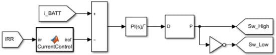 The battery charging current must never exceed 58 A as a maximum value according to Table 4. For instance, at the maximum value of the current that is extractable from the PVA is valued at 58 A, where at , its value becomes 33 A. With that being said, a reference current , which is mainly dependent on the solar irradiance levels, must be considered as a reference for high/low sides MOSFETs PWM generation. To ensure that is as closest as possible to , these two quantities are differentiated, where the resulting error signal (if any) will later be fed into a Proportional Integral (PI) controller as shown in Figure 11.