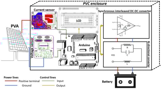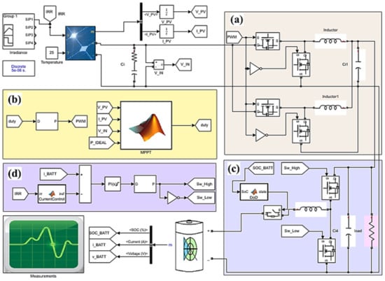 By taking all of the previous steps into consideration, a complete version of the solar charger is hence produced, in a cascaded topology, beginning by the PVA as main input, then successively toward the DC-DC converter (controlled by the modified P&O algorithm), then the bi-directional converter (controlled by a current control scheme), then eventually to the battery’s terminals.