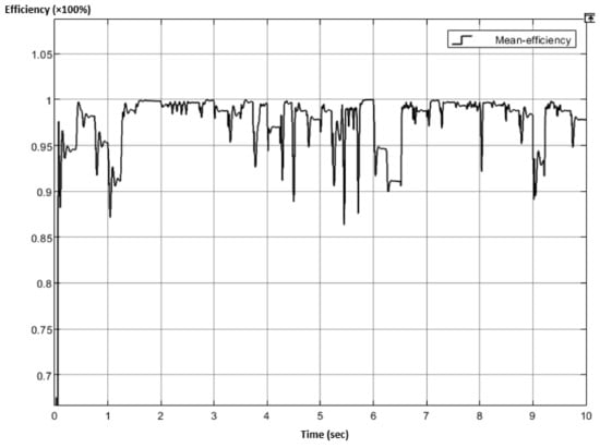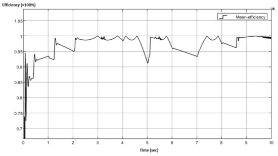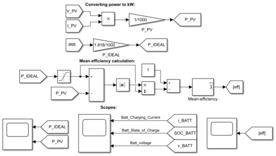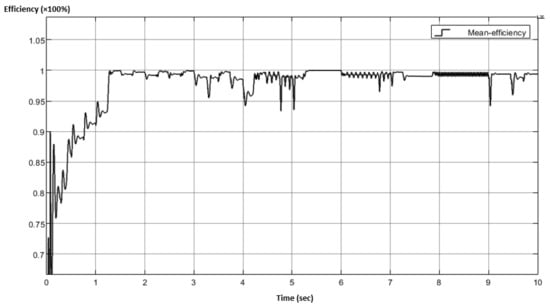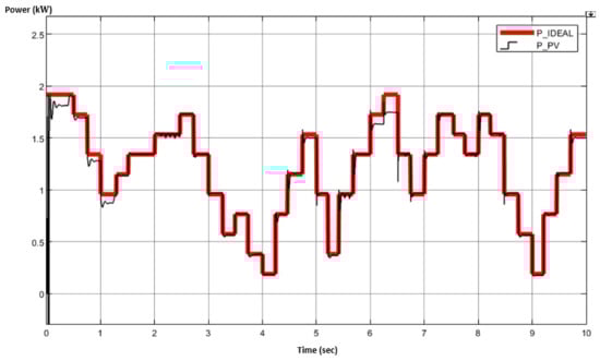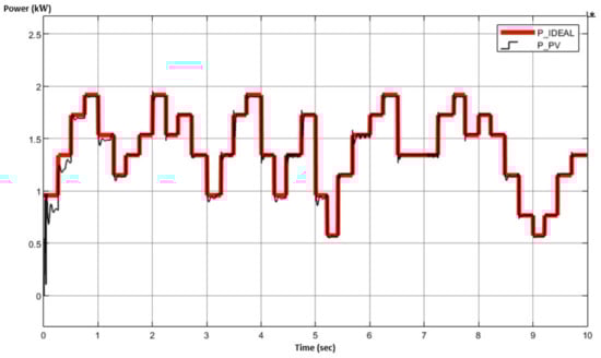 where , represent the required output voltage and PV input voltage, respectively, with representing the converter’s efficiency. Assuming a 100% efficiency (for simulation purposes only), and a of 87 V (according to Figure 1), the duty ratio must be for instance equal to 0.298. This value is continuously increased/decreased according to the MPPT algorithm variations. Both and values can be calculated according to Equations (8) and (9) [121,122].