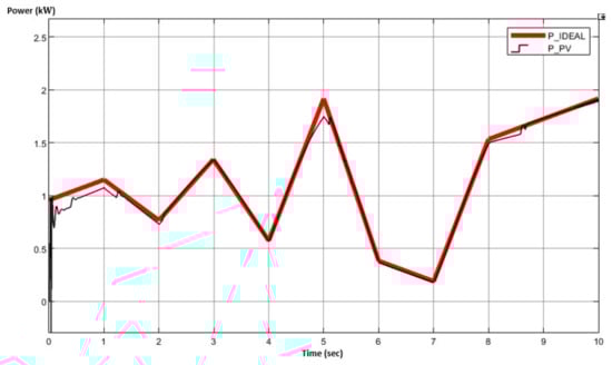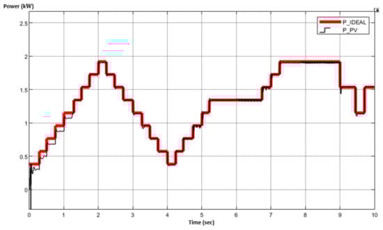 A conventional P&O algorithm could lead to an erroneous behavior under swiftly varying irradiance conditions [117]. Specifically, for the shading patterns created in Figure 3, the shading intensity varies within a 0.1 s to 0.5 s time lapses. Accordingly, the power difference between ideal and actual power curves , as well as the voltage difference between PV and input voltage curves , could possibly lead to a “false” zero as shown in Figure 6. Therefore, an inaccurate duty ratio is generated by the MPPT algorithm, provoking a decrease in the system’s efficiency, since the total available power from the PVA cannot be then extracted. The small valued power differences in the time frame for example, are not taken into consideration in the conventional P&O algorithm.