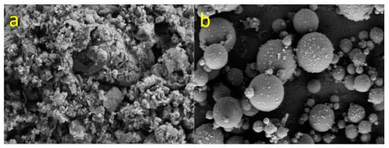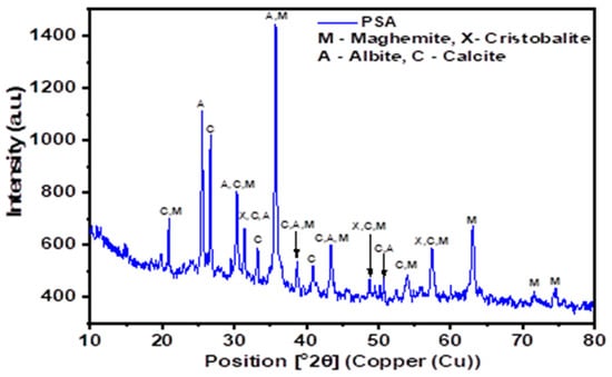 A refinery in Malaysia accumulated black, sticky, and semi-solid petroleum sludge. Department of Environment, Malaysia (2010 guidelines) classified petroleum sludge as scheduled waste (SW314). PSA (petroleum sludge ash) was made by burning the sludge and then milling it in a milling machine before sieving it through a 45-micrometer sieve size [26]. The Manjung coal power station in Malaysia provided fly ash (FA) with a high calcium content. The main aluminosilicate source material was FA. The chemical composition of PSA and FA was determined by XRF and is shown in Table 1. The PSA has a total percentage of Al2O3, Fe2O3, and SiO2 of 70.80 percent, with a loss on ignition (LOI) of 0.09 percent and calcium oxide of 9.26 percent, while the FA has a total percentage of Fe2O3, Al2O3, and SiO2 of 74%, and so meets the ASTM C618-15 specification [27]. The FESEM was used to determine the morphology of FA and PSA, as shown in Figure 1. The micrograph of PSA (Figure 1a) indicates that the PSA has angular grains whereas the morphology of the FA (Figure 1b) showed spherical particles, allowing them to blend in the mixtures. From a local supplier, the NaOH (NH, purity 99%) and liquid Na2SiO3 (NS) with Na2O 14.37 wt %, SiO2 29.54 wt%, and H2O 56.09 wt% were obtained. Sand with 2.52 fineness modulus complying with ASTM C33/C33M—13 was used to make the geopolymer mortar [28]. Figure 2 depicts the PSA XRD pattern. Albite, maghemite, calcite, and cristobalite were the most abundant minerals found.