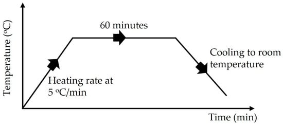 The proportions of geopolymer mortar are shown in Table 2. Geopolymer mortar samples were made with a 0.5 alkaline solution to binder ratio, a 2 NS to NH ratio, and a NaOH molarity of 12. In addition, a 1:2 binder-to-sand ratio was employed [29]. The pellets of NH were dissolved in the needed amount of water to make NaOH solution the day before the mortar specimens were made and then allowed to cool to room temperature. The activation solution was made by mixing the requisite amounts of NS and NH solutions homogeneously in a beaker [30]. PSA, FA, and fine aggregates were measured and thoroughly mixed for about two minutes in a Hobart mixer. Furthermore, the mixture was cast into a 50-mm cubic mold. The molds were filled and compacted carefully using a vibrating table for about 30 s. After 1 day, the hardened geopolymer mortar specimens were demolded. The mortar samples were oven cured for 20 h at a temperature of 60 °C [31]. After that, the specimens were maintained in the laboratory at a temperature of 20 ± 2 °C and relative humidity of 60% until the testing day (28th day). The specimens were then placed in an electrical muffle furnace and heated to 200 °C, 400 °C, 600 °C, 800 °C, and 1000 °C. The process of heating the specimen shown in Figure 3, was done according to Payakaniti P. et. al. [32]. 5 °C/min heating rate was used until the temperature targeted was reached. This rate of heating is in line with the standard recommendation of RILEM 129-MHT [33]. The geopolymer mortar specimens were left in the furnace for 60 min at the target temperature. The muffle furnace was turned off once the time had passed [34]. The mortar specimens were then allowed to cool to laboratory temperature in the furnace. The calcination period for the geopolymer mortar was set to reduce the temperature differential between the inner core and outside surfaces of the mortar samples and to achieve an inner core temperature that was closer to the required temperature.