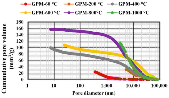 The MIP test was used to assess the porosity of geopolymer mortar samples after exposure to various temperatures. The results of cumulative porosity of the geopolymer mortars as pore diameter functions are shown in Figure 5. The temperature effect on the geopolymer mortar soundness may be evaluated in terms of the increased or decreased distribution of pore diameter, the total volume of pores, and accessible porosity. From Figure 5, the cumulative pore volume of geopolymer mortars exposed to 60 °C, 200 °C, 400 °C, 600 °C, 800 °C, and 1000 °C (GPM-60 °C, GPM-200 °C, GPM-400 °C, GPM-600 °C, GPM-800 °C, and GPM-1000 °C) are 24.52 mm3/g, 31.14 mm3/g, 98.31 mm3/g, 106.16 mm3/g, 156.41 mm3/g, and 114 mm3/g, respectively. It was observed that with the increase in temperature, the cumulative pore volume increased. The lower porosity of the reference geopolymer mortar subjected to a temperature of 60 °C (GPM-60 °C) results in higher compressive strength. The porosity value, in this study, at the final temperature (1000 °C) was higher than the control value by more than a factor of two. The porosity increase in the geopolymer mortar is associated with cracking and had a destructive effect on the structure of the material and damage evolution [37]. Table 3 also includes some interesting index parameters that define the properties of a penetrable structure. The volume change of the mercury penetration was used to determine the average pore diameter, median pore diameter, and total surface area of the pores [38]. The modal pore diameter was determined by the fluctuation in pore volume as a function of strength variation. The average pore diameter ranged between 74.34 and 11,895.25 nm, as shown in the table.