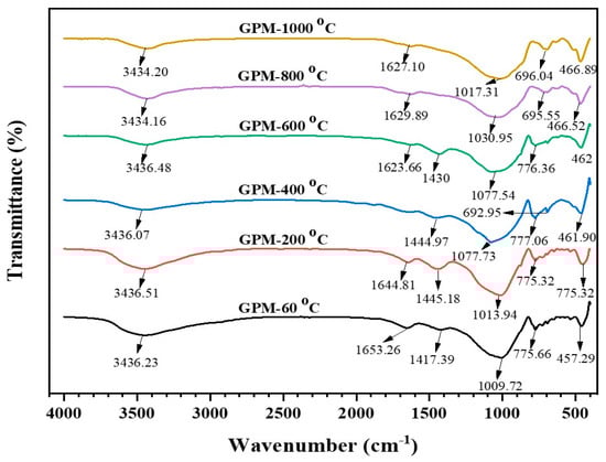 Figure 6 depicts the FTIR spectra of the specimens after exposure to different elevated temperatures. The reference sample (GPM-60 °C) had a broad absorption band, around 1009.72 cm−1, caused by the asymmetric bending vibration of Si-O-Al and Si-O-Si (Si–O–T). This peak shifted to the right and increased by a small amount after the exposure of samples to higher temperatures, which is a key indicator of geopolymerization. This shift indicates that the number of Si–O–T bonds increased because of the dihydroxylation process [39]. During the geopolymerization reaction, Al atoms were inserted into the network of geopolymer which increase the amount of non-bridged oxygen atoms. Si–O–T peak comprises a series of peaks that partly overlap with one another. The absorption peak around 3435 cm−1 corresponds to the stretching vibrations of the Si-OH bond OH group (hydroxyl). The peak adsorbed water molecules on the precursor surface. The assigned absorption peaks to the bending vibration of the –OH and H–O–H group of the hydrated products of reaction that are related to water appear at 1650 cm−1. From 690 to 780 cm−1, absorption bands are designated to Si–O–Si and Al–O–Si vibrations which are attributed to the formation of N–A–S–H. Around 777 cm−1, the absorption peak indicated the existence of quartz (Si–O) functional groups.