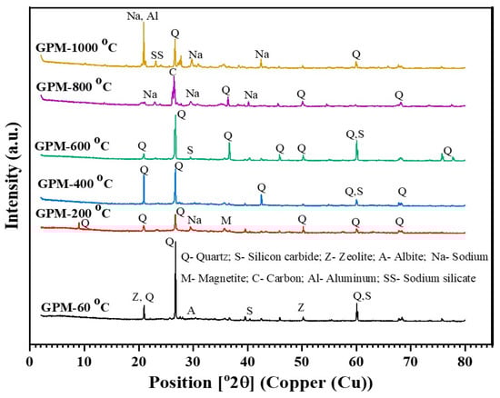 XRD was conducted to examine the nature and composition of the reaction products in geopolymer mixtures. Figure 7 depicts the XRD patterns of the specimens after exposure to different elevated temperatures (60 °C, 200 °C, 400 °C, 600 °C, 800 °C, and 1000 °C). The patterns display a noisy and broad background between 20° and 60° 2-theta and the amorphous gels formation of the geopolymerization can be confirmed from the broad humps. Similar findings were reported by [40]. The thermally stable quartz which is present in the fly ash was found at all temperatures [41]. The XRD evaluation revealed that carbon begins to form at 800 °C. Sodium silicate and aluminum were seen at 1000 °C. Quartz is widely seen in this temperature range in FA-based geopolymer mortars. The un-even transformation of phases at elevated temperatures results in the geopolymer matrix breakdown, volume expansion, as well as changes in the microstructure. The volume difference in the geopolymer matrix results in high stress on the material and speeds up crack formation [42]. This high stress and crack formation led to the loss in compressive strength at temperatures over 800 °C.