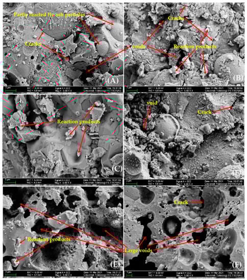 Figure 8 depicts the images of the microstructure of calcined geopolymer mortars and shows noticeable changes in the microstructure of the geopolymer matrices as heated to 1000 °C. For the amorphous structure of the geopolymer mortar sample heated at 60 °C, it shows unreacted fly ash particles, reaction products, voids, and cracks observed in Figure 8A. When the heating temperature increased to 200 °C (Figure 8B), a smaller amount of partly reacted fly ash particles were observed, and more reaction products were seen. At a temperature of 400 °C (Figure 8C), a small number of new products was seen around partly-reacted particles of fly ash. This finding is in line with reported results [43]. The microstructure of geopolymer mortar after exposure to temperatures of 600 °C is shown in Figure 8D. The matrix shows no new reaction products. At this temperature, decomposition of the geopolymer matrix begins with porosity increasing. Figure 8E,F depict the geopolymer mortars exposed to temperatures of 800 °C and 1000 °C. The matrices are similar to interconnected pores which decreased the compressive strength of the geopolymer [44]. Significantly fewer partly-reacted fly ash particles and visible cracks in the microstructure were noticed. This was because of the higher pressure that elevated temperature applied in the matrices of geopolymer mortars [23]. At the temperature of 1000 °C, the micrograph showed a large void that was approximately 2–10 μm in diameter. This porosity was due to materials decomposition after calcination [45]. EDX quantitative determination of the main geopolymer mortar elements before and after exposure to different high temperatures is shown in Figure 9.