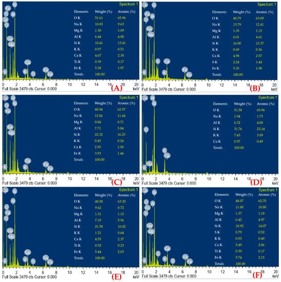 EDX quantitative determination of the geopolymer mortar elements at temperatures of (A) 60 °C, (B) 200 °C, (C) 400 °C, (D) 600 °C, (E) 800 °C, and (F) 1000 °C.
