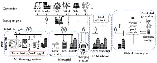 In contrast to conventional EPSs, MGs have very specific characteristics. For example, a set that includes generators and loads that are connected to the electrical grid through the Point of Common Coupling (PCC), which acts as a single element facing it. Likewise, the MGs have, in general, low voltage levels, a greater proximity between the generation and consumption points (usually the building itself in which the generation is installed) and, on occasions, interconnections with heat, transport, and other complementary systems (for example, biogas plants for waste management).