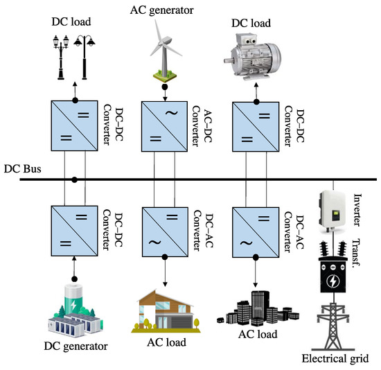 The majority of generators of a MG create power in DC, which is converted into AC by means of a PC to adapt to the electrical grid since some equipment needs AC to work. However, the conversion from DC–AC–DC to AC–MG causes losses in the transmission lines, which reduces the efficiency of the system. This can be remedied, though, by using a DC–MG because it reduces the number of PCs in a single conversion process [53]. In [54], the authors affirm that for distribution systems in residential areas, DC–MGs are the best option. Among the main advantages of DC–MGs are the improvement in efficiency and the enormous ease in integrating and optimizing Distributed Energy Resources (DERs). In addition, they solve some control problems; for example, the primary control is considerably simpler because of the absence of reactive power-flow management. Regarding the ease of integrating and optimizing DERs, it is important to note that for both RESs (conventional high efficiency) and ESSs, the vast majority originally operate in DC or need at least one DC stage before interconnection (micro-wind turbines, gas micro-turbines, hydraulic micro-turbines, and flywheels, among others). As a result, using a DC–MG facilitates the interconnection of DERs as it simplifies power conditioning devices and can help mitigate problems arising from frequency regulation and the synchronization present in AC grids. When the DC–MG operates in island mode, it becomes more resistant to major failures in the main grid. Furthermore, it is much easier to design a DC–MG since there are no problems related to synchronization and reactive power flows. Figure 3 shows the typical configuration of a DC–MG.