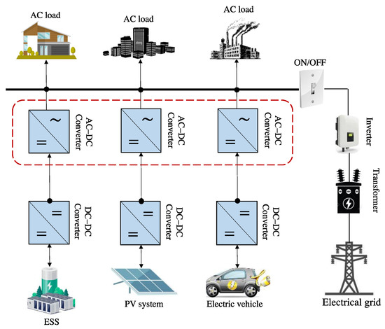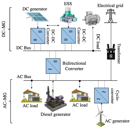 Figure 2 shows the diagram of a typical AC–MG. In this system, all distributed generators, including ESSs and loads, are linked to the AC grids buses via a PC. However, it is possible to connect AC generators, like microturbines, diesel, and wind turbines (WTs), to an electrical grid without the need to connect PCs. Alternatively, to connect DC RESs, such as battery-based ESSs (BESS) and PV systems, to the electrical grid, a DC–AC inverter is essential. Therefore, the loads are directly connected to the AC buses. However, AC–MGs possess some inconveniences, such as complex control and synchronization issues with the grid. Nevertheless, this type of MG is the most widely used today.